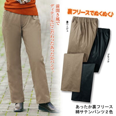 目玉新商品1,000円 あったか裏フリース綿サテンパンツ カラーは、どんなお洋服でも合わせやすい黒・濃ベージュの2色をご用意 股下70cm共通 寒い日のお出かけに!部屋着に! 商品詳細情報 商品名 あったか裏フリース綿サテンパンツ サイズ M・L・LL カラー 黒・濃ベージュ 特徴 ・ウエスト両脇・後ろゴム使い ・ポケット付2カ所 ・ベルト通し付 素材 表地 綿97%・ポリウレタン3% 裏側フリース部分 ポリエステル100% 洗濯表示 ◆ドライ(セキユ系) ◆洗濯機可(ネット使用) ご注意 ※コーディネートに使用している小物やアクセサリーは商品には含まれません。