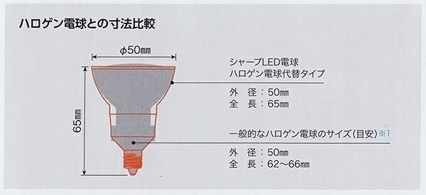 ≪シャープ LED電球 エルム ダイクロハロゲン電球タイプ ひと粒タイプ ホワイト≫ ワット区分 光色 品番 口金 全長 外径 全光束 最大光度 ビーム角 平均演色評価数 メーカー希望小売価格 梱包 単価 定格寿命 4.8W 電球色相当2700K DL-JN52L E11 65mm 50mm 430lm 6,000cd 狭角(12.5°) Ra82 OPEN 1個 2,980円 40,000h DL-JM52L 440lm 3,150cd 中角(19°) 1個 2,980円 DL-JW52L 430lm 1,350cd 広角(31°) 1個 2,980円 ※上記金額はすべて税抜き金額となっています。